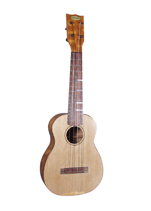 The customer wanted this ukulele designed with a few elaborate choices but wanted me to keep all the elements subtle and this gorgeous instrument is what we ended up with. The soundboard is Western Red Cedar inlaid with a koa ‘moustache’ at its lower edge. The body is quilted Honduran Mahogany. The edge binding is Snakewood as is the soundhole rosette. Particularly cool are the koa stripes dropping down the back of the mahogany neck and terminating into short ‘brushstrokes’ onto the body.